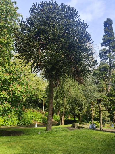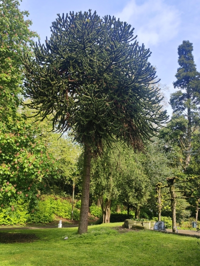 Araucaria araucana is de speciale conifeer die ook wel apenboom, slangenden of apenverdriet genoemd wordt. Die naam heeft de conifeer te danken aan zijn vlijmscherpe, driehoekige bladschubben, die aan het einde in een scherpe punt toelopen. Het zijn dus schubben waarvan apen inderdaad wel eens veel verdriet zouden kunnen hebben als ze van boom tot boom springend in deze pijnlijke schubben zouden terecht komen. Door de gemene stekels kunnen de apen de zaadbolsters (lijken wel grote ananasvormige kegels) niet pakken.